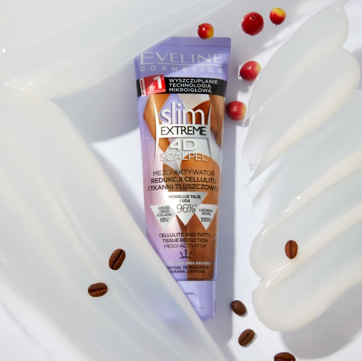 - Cafeina – stimulează microcirculația, susține drenajul limfatic și netezește pielea cu celulită.